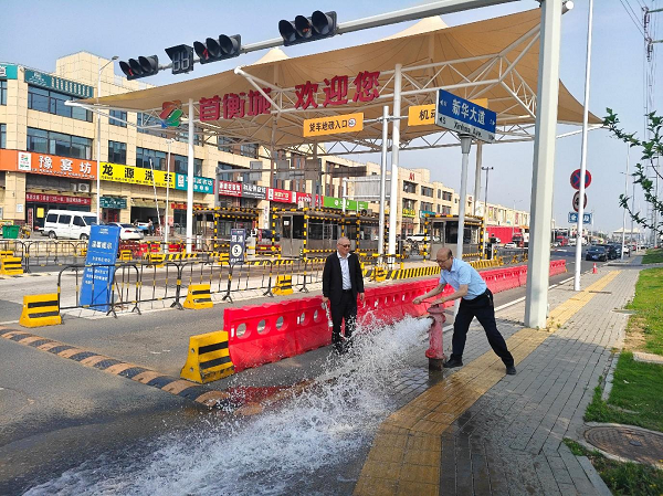 在首衡城農(nóng)產(chǎn)品交易中心,工作人員對(duì)市場入口和市場內(nèi)各貿(mào)易場所的消防設(shè)施進(jìn)行了檢查,逐一開閘試水,確保水源通暢,檢查栓體各配件是否完好,有無松脫,閘閥能否正常啟閉等。