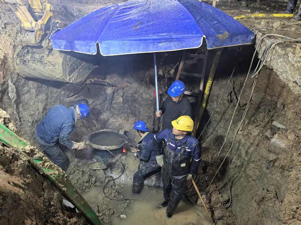 為將停水影響降至最低,運維部經周密研判,果斷決定將施工窗口期設定在深夜。技術人員連夜開挖探查,根據管道破損實際情況精準制定多套維修方案,最終克服技術難題,選定高難度的帶水作業(yè)方案,最大限度縮短停水時長。