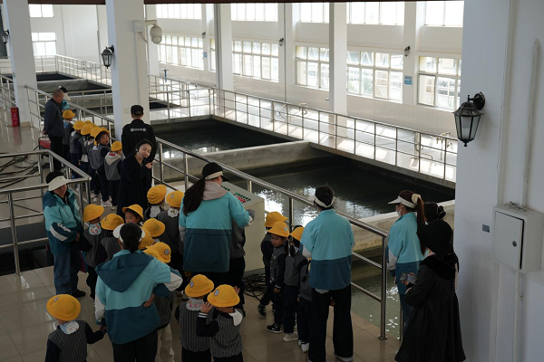 為貼合幼兒認(rèn)知特點,公司精心安排了4名專業(yè)講解員、10名引導(dǎo)員及6名安全員,全程保障活動安全有序開展。在講解員生動通俗的引導(dǎo)下,孩子們分組依次參觀了反應(yīng)池、沉淀池、濾池、清水池、送水泵房及調(diào)度室等核心生產(chǎn)區(qū)域,親眼見證了“渾濁原水”變身“潔凈自來水”的奇妙過程。在反應(yīng)池和沉淀池,講解員用“魔法藥劑”的生動比喻,向孩子們講解混凝劑的作用,引導(dǎo)大家觀察水中雜質(zhì)凝結(jié)成絮狀物并沉淀的過程;在濾池,工作人員現(xiàn)場演示過濾原理,讓孩子們直觀感受水的凈化效果;在清水池,孩子們了解到潔凈水的儲存與調(diào)配方式;在送水泵房和調(diào)度室,自動化供水設(shè)備、城市供水管網(wǎng)實時運行畫面,讓孩子們真切感受到城市供水系統(tǒng)的智慧與高效,讀懂了每一滴水從水廠到家中水龍頭的完整旅程。
